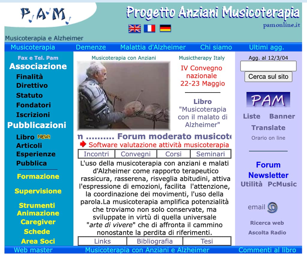 Il P.A.M nasce nell’Agosto 99 e si costituisce Associazione nel Dicembre 2000 per volontà di un gruppo di persone riunitesi nell’ambito di un corso di musicoterapia (Assisi). L’intento è quello di promuovere iniziative a carattere nazionale o locale sul lavoro di musicoterapia con anziani. L’iniziativa non dipende da scuole, enti o istituzioni ed è nostra intenzione condividere gli intenti con chiunque possa portare un valido contributo alla ricerca del settore.